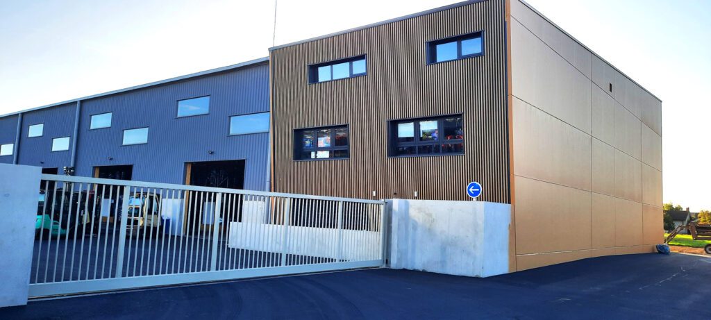 Courant Holding MANZIAT (01) Extension d’un site industriel et création d’un bassin de rétention Maîtrise d’Ouvrage Courant Holding Maîtrise d’Œuvre A.T.W. (Architecte mandataire) TW INGÉNIERIE (Bureau d’études tous corps d’état) IB2A (Bureau d’études structure) Budget 4 100 000 € HT Résumé Construction d’une extension abritant un atelier de conditionnement, un espace de stockage et un espace de bureaux en open-space et locaux sociaux sur deux niveaux : ■ Atténuation de l’effet de hauteur des parois en béton par un ton beige clair, reprenant les codes de l’architecture vernaculaire en pisé de la Bresse; ■ Implantation de nouveaux emplacements de stationnements pour poids-lourds; ■ Installation d’un nouveau local RIA ainsi que plusieurs rampes d’accès pour poids-lourds et engins de manutention; ■ Mise en conformité PMR de la zone réservée aux bureaux et locaux sociaux en rez-de-chaussée; ■ Création d’un nouveau portail; ■ Prémur béton teinté dans la masse, ton beige clair, béton préfabriqué gommé ton beige clair avec granulats type galets; ■ Façade métallique beige clair et imitation claire-voie, toiture inclinée pour installation de panneaux photovoltaïques; ■ Puits de lumière en verre; ■ Travaux réalisés en site occupé; ■ Performance thermique RT2012. Retour